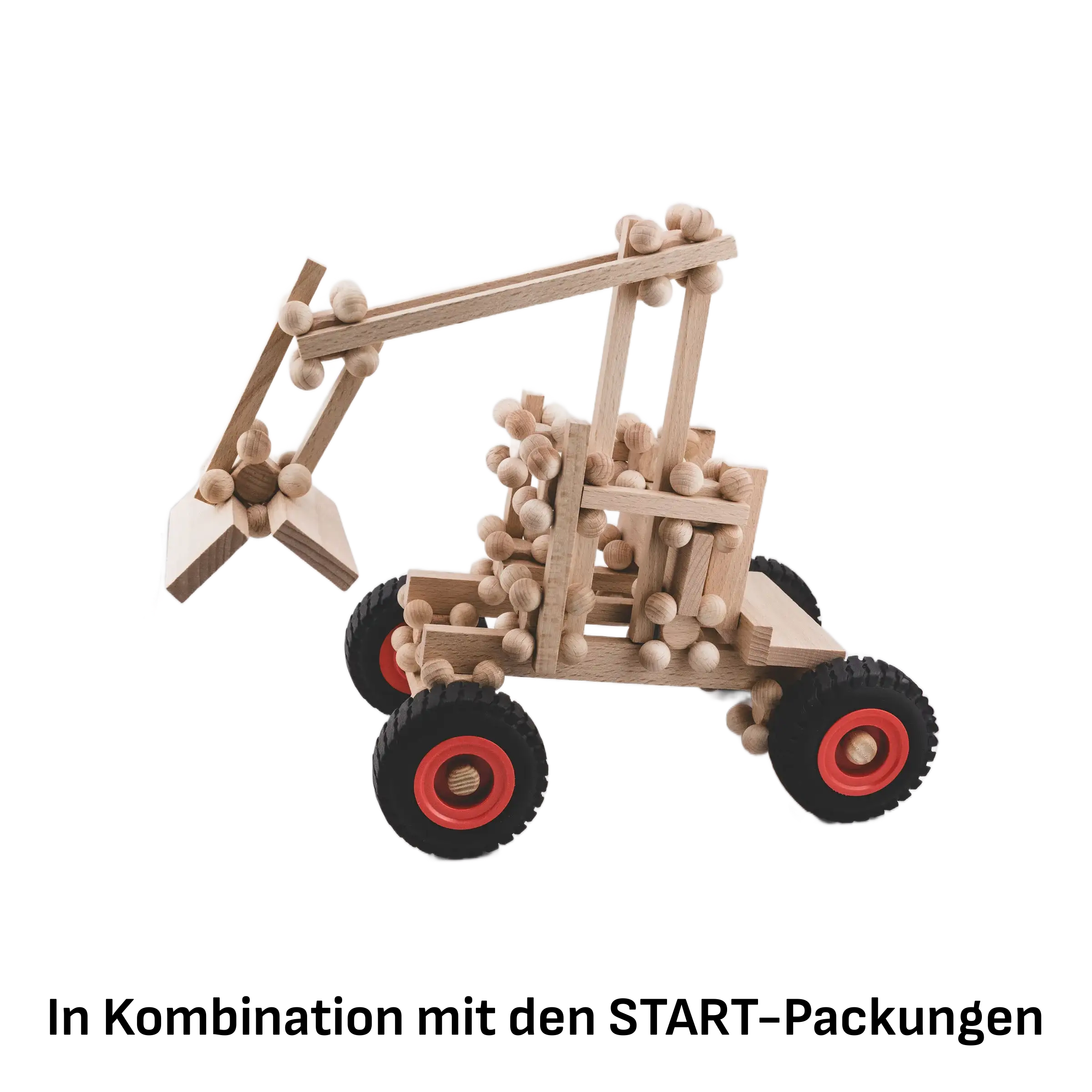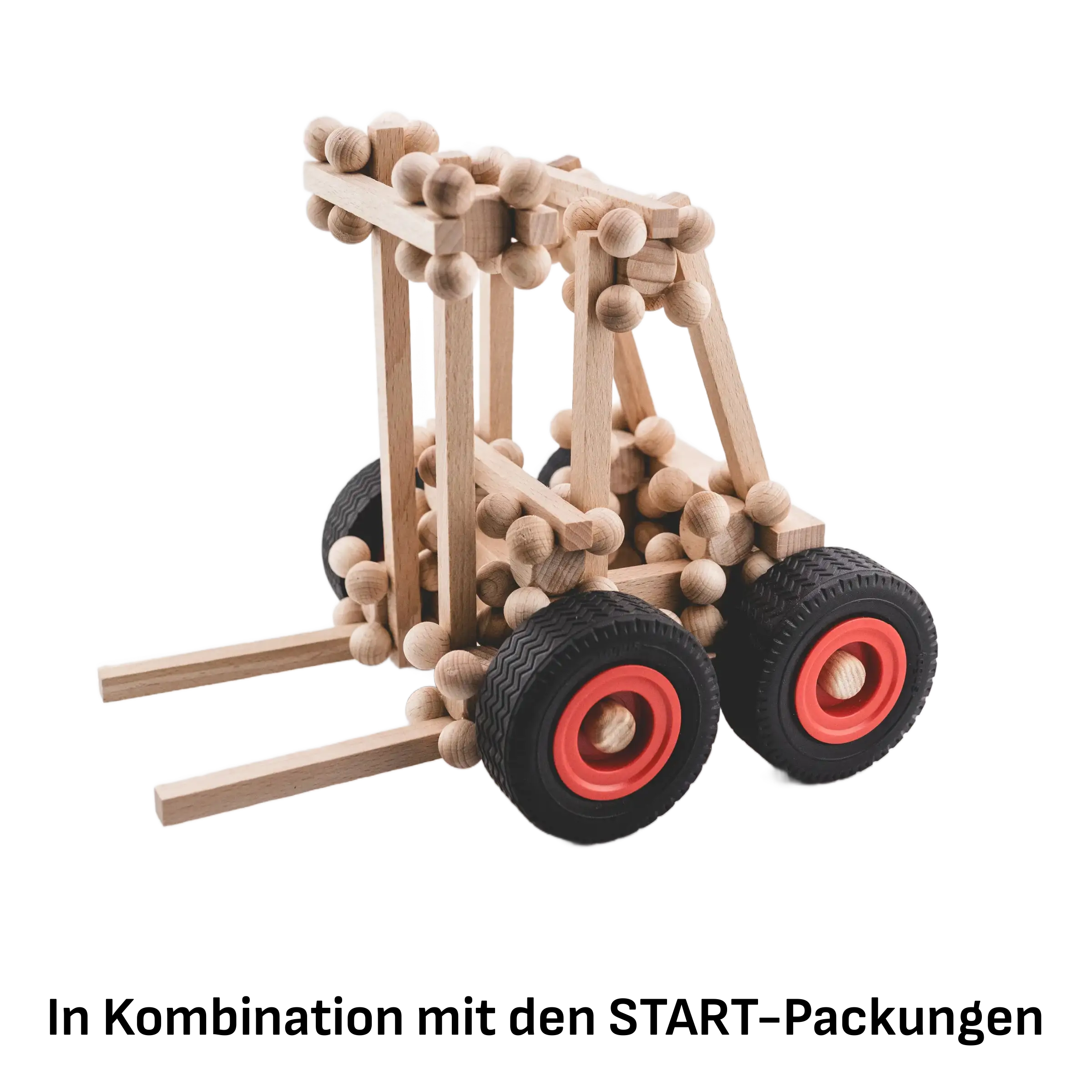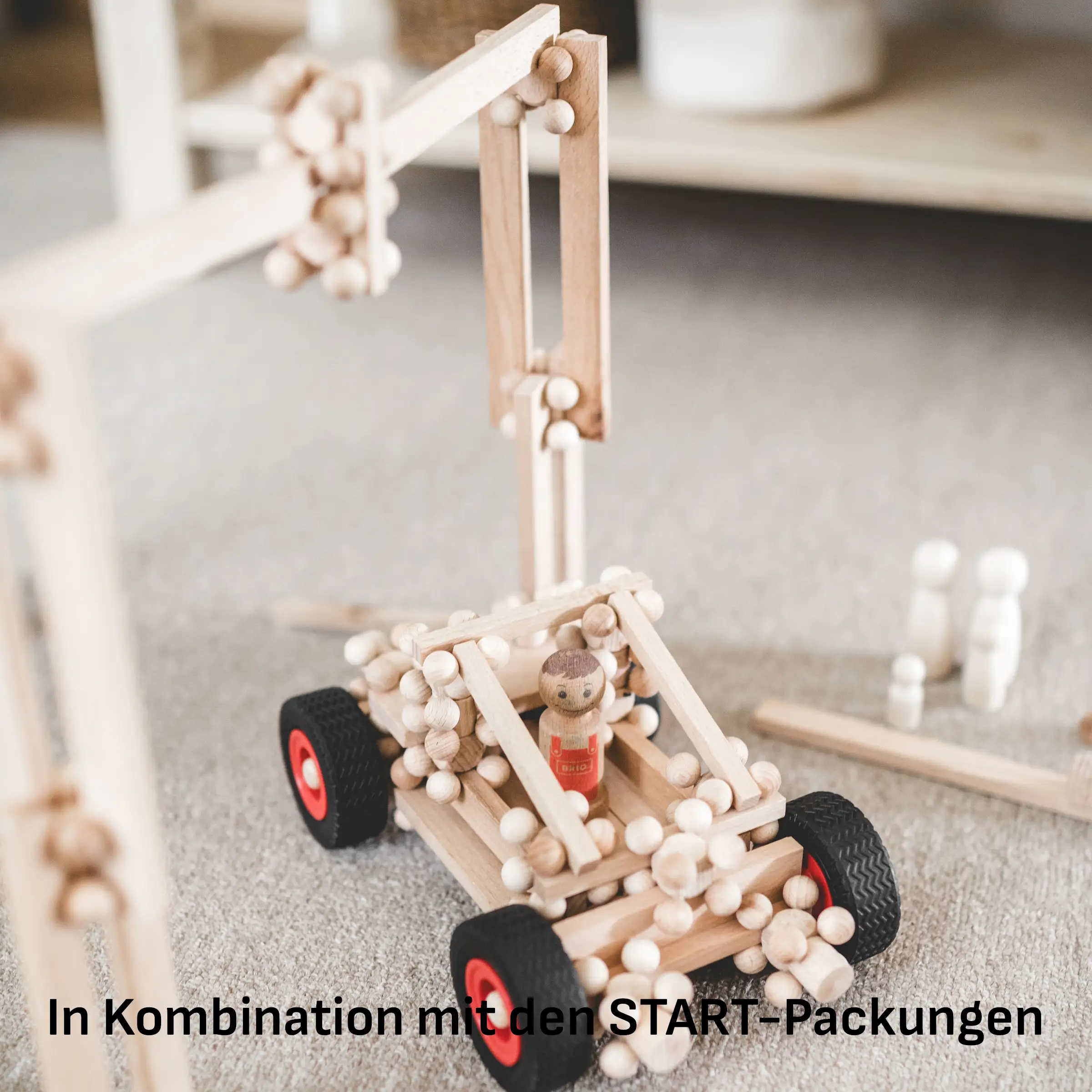 Mit den TIMBERIX Wheels kommt Bewegung ins Spiel! Ab sofort kannst du deine Bauwerke auf Rollen setzen und dir eigene Fahrzeuge bauen. Ob Rennwagen, Traktor, Tiertransporter oder ein völlig neues Fantasie-Gefährt – deiner Kreativität sind keine Grenzen gesetzt.
